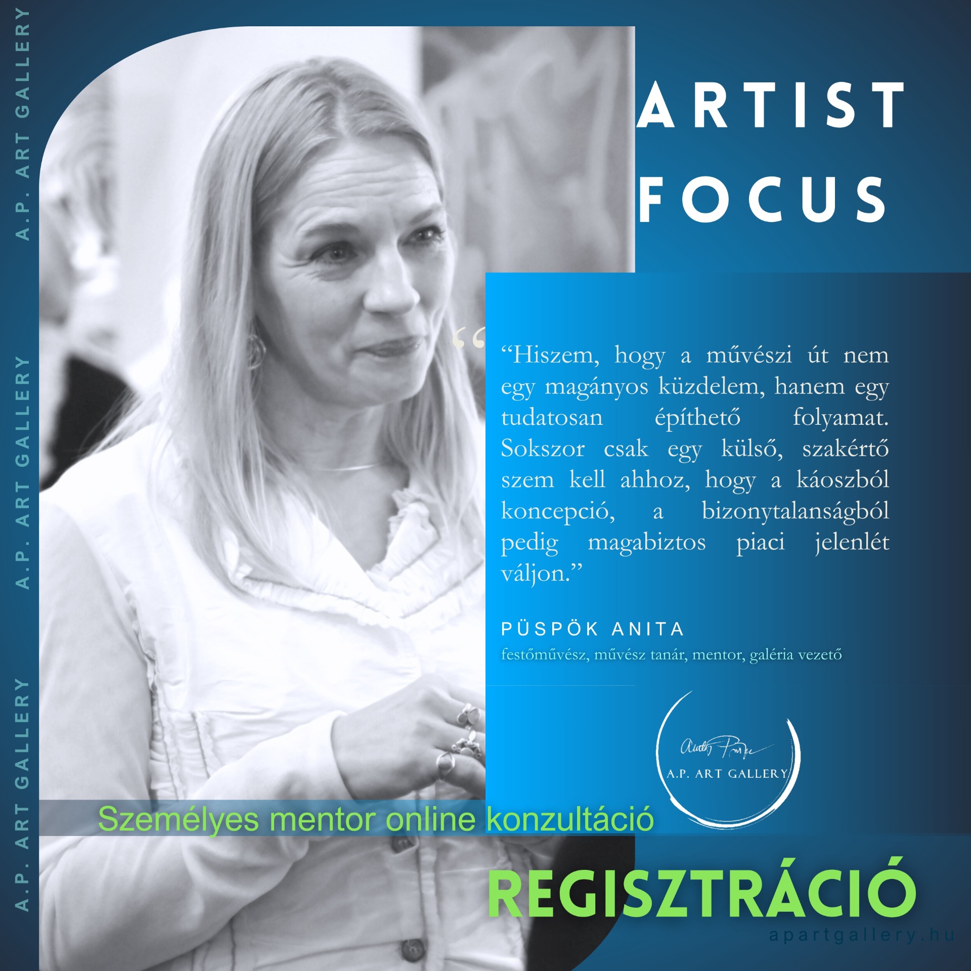 ARTIST FOCUS – Személyre szabott mentorkonzultáció   ONLINE KONZULTÁCIÓ Helyezzük fókuszba a művészetedet és a karrieredet egyetlen intenzív órában. Amiben segíteni tudok neked: Szellemiség és Koncepció: Tisztázzuk az alkotói filozófiádat és a műveid mögötti narratívát. Segítek, hogy az üzeneted érthető és átütő legyen. Karrierút és Stratégia: Megoldást keresünk az aktuális elakadásaidra, és megnézzük a piaci pozicionálásodat. (Különösen hasznos, ha az Artmentor program  érdekel, ha szintet lépnél, ha pályázatra, kiállításra készülsz.) Portfólió Audit: Átnézzük az online megjelenésedet és a munkáid válogatását, hogy a legjobb arcodat mutasd a galériák és gyűjtők felé. Ez a fókuszált, 60 perces online óra teljesen a te igényeidre épül. Nemcsak beszélgetünk: mélyelemzést végzek és konkrét szakmai javaslatokkal látlak el. Hogyan indulunk?   A regisztrációdat követően kérjük, töltsd ki és küldd el az űrlapot, hogy előzetesen átnézzük munkásságod. Amint beérkezik a regisztrációd, e-mailen egyeztetjük a konzultáció időpontját.  Kérlek, a maximális hatékonyság érdekében készítsd össze előre a kérdéseidet! Díj: 24.900 Ft / 60 perc online konzultáció Tartalmazza az előzetes felkészülést és az elemzést is.  Szeretettel várom a beszélgetést! Személyes mentorod: PÜSPÖK ANITA festőművész, művész tanár, mentor, galéria vezető REGISZTRÁLOK AZ EGYÉNI KONZULTÁCIÓRA