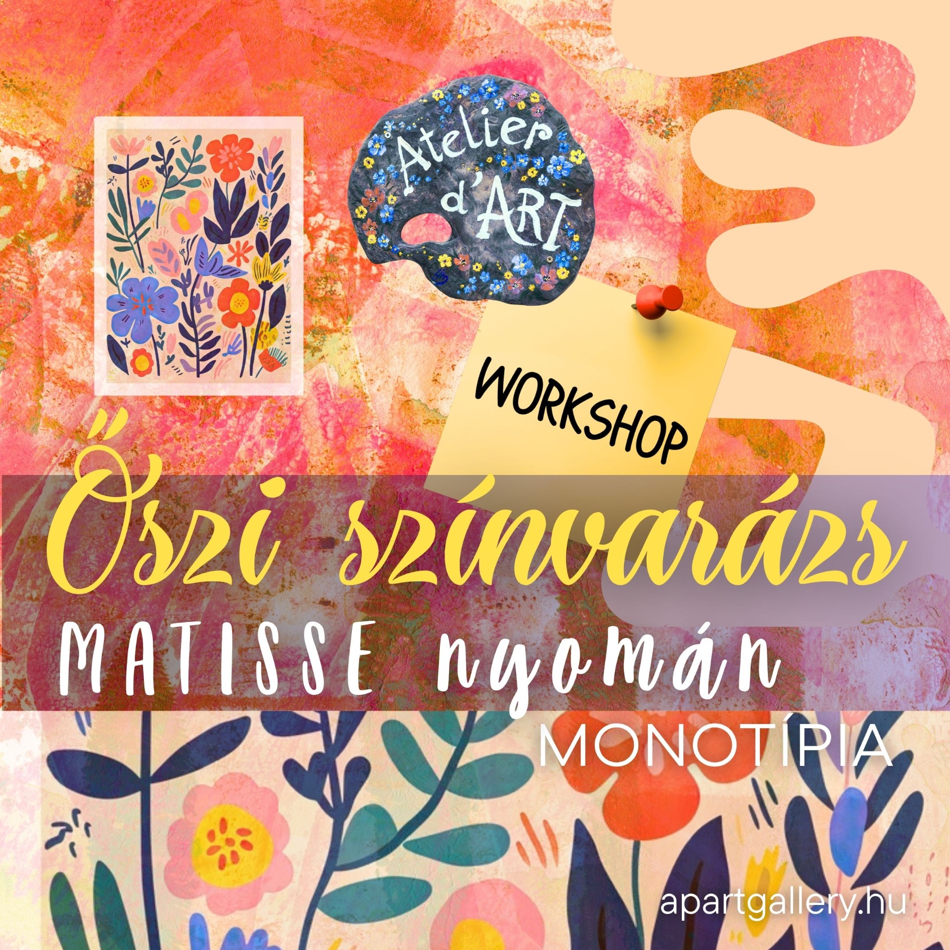 Őszi színvarázs – Matisse nyomán / Monotípia festő workshop Ajánlott korhatár: 10 éves kortól Utazás a színek és formák világába és Matisse művészetébe Fedezd fel az alkotás szabadságát! Monotípia workshop gyerekeknek – Természeti formák nyomatai Csatlakozz Püspök Anita festőművész kreatív workshopjához, ahol könnyed és inspiráló módon ismerkedhetsz meg Henri Matisse művészetével és a monotípia , mint festészeti technika varázslatos világával. A foglalkozáson egyedi nyomatokat készítünk természeti formák felhasználásával, miközben különféle rajzos és festészeti eszközöket is kipróbálhatsz. Az alkotás papírra készül – a papír mérete szabadon választható –, így a művet otthon könnyedén keretbe helyezheted . Mire számíthatsz? Művészettörténeti bevezető: Matisse művészete Monotípia technikája és a természet inspiráló mintái Saját alkotás készítése: levelek, virágok és egyéb természeti formák nyomatai festékkel Különféle festészeti, rajzi technikák és anyagok kipróbálása A kész művet szárítva, hazavihető formában kapod meg Nincs szükség előképzettségre – minden eszközt biztosítunk: festékek, papírok, ecsetek, médiumok és kötények. Neked csak a kreativitásodat kell hoznod! Praktikus tudnivalók: Érkezz 15 perccel korábban, festéshez alkalmas ruhában (át is öltözhetsz nálunk) A program kb. 2 órás, a műveket megszárítjuk, így haza is viheted Választhatsz páros, csoportos vagy "Szülő & Gyerek" kedvezményt – gyere barátaiddal vagy családoddal, és élvezzétek együtt az alkotás örömét! Helyszín: A.P.Art Gallery – 1085 Budapest, József krt. 64. Szeretettel várunk egy színekben és élményben gazdag közös alkotásra!